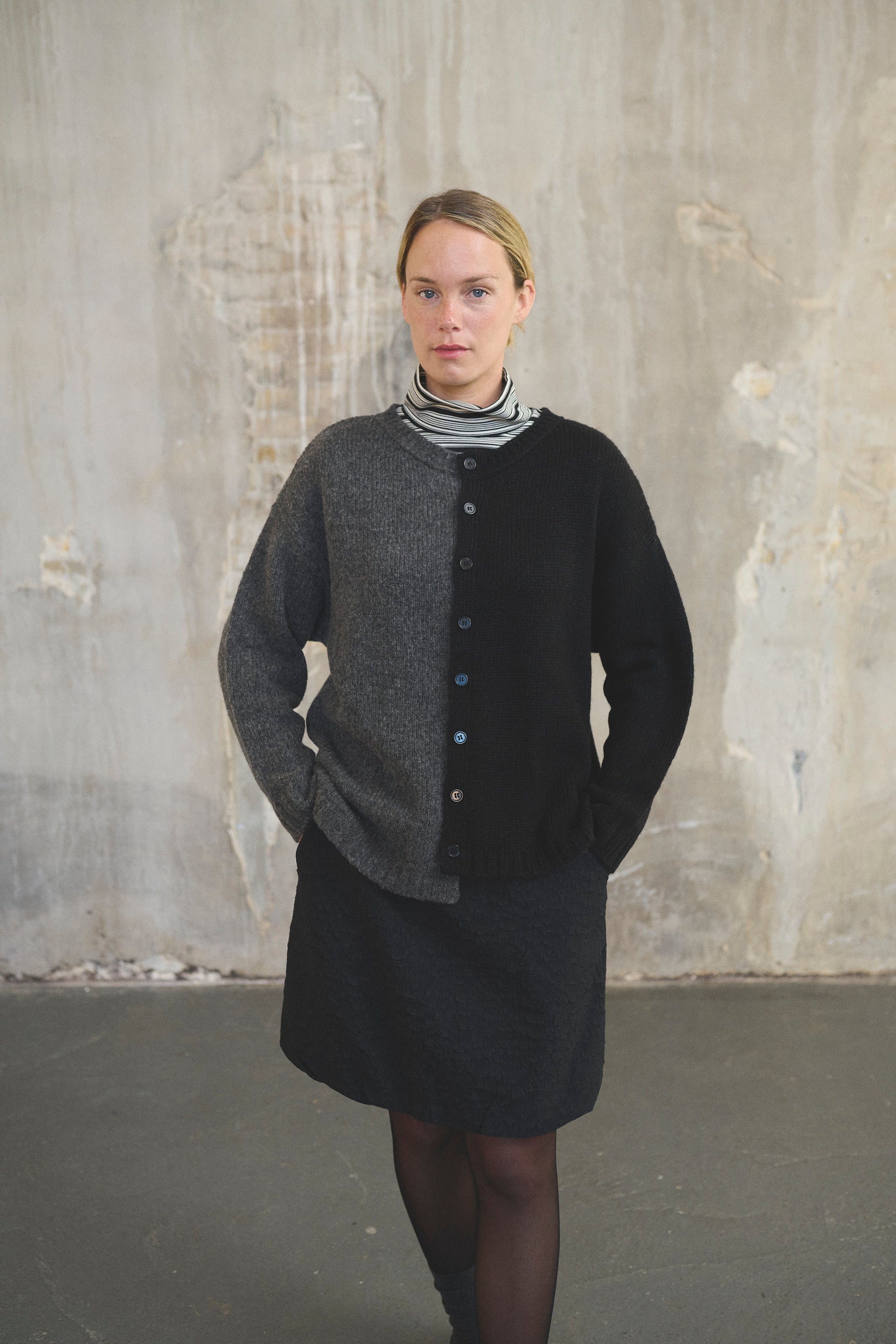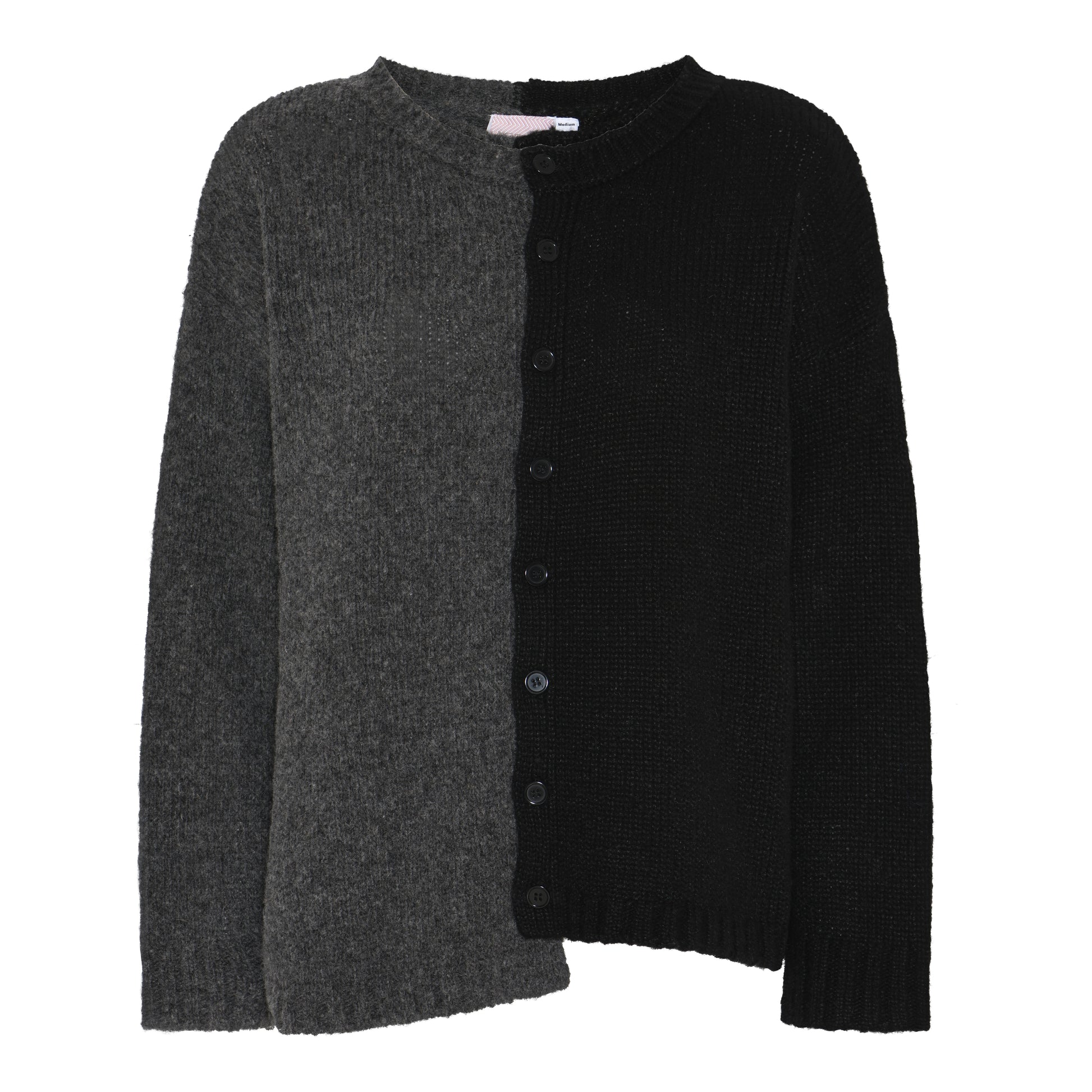 A knitted cardigan with an uneven detail, in a mix of black and grey.